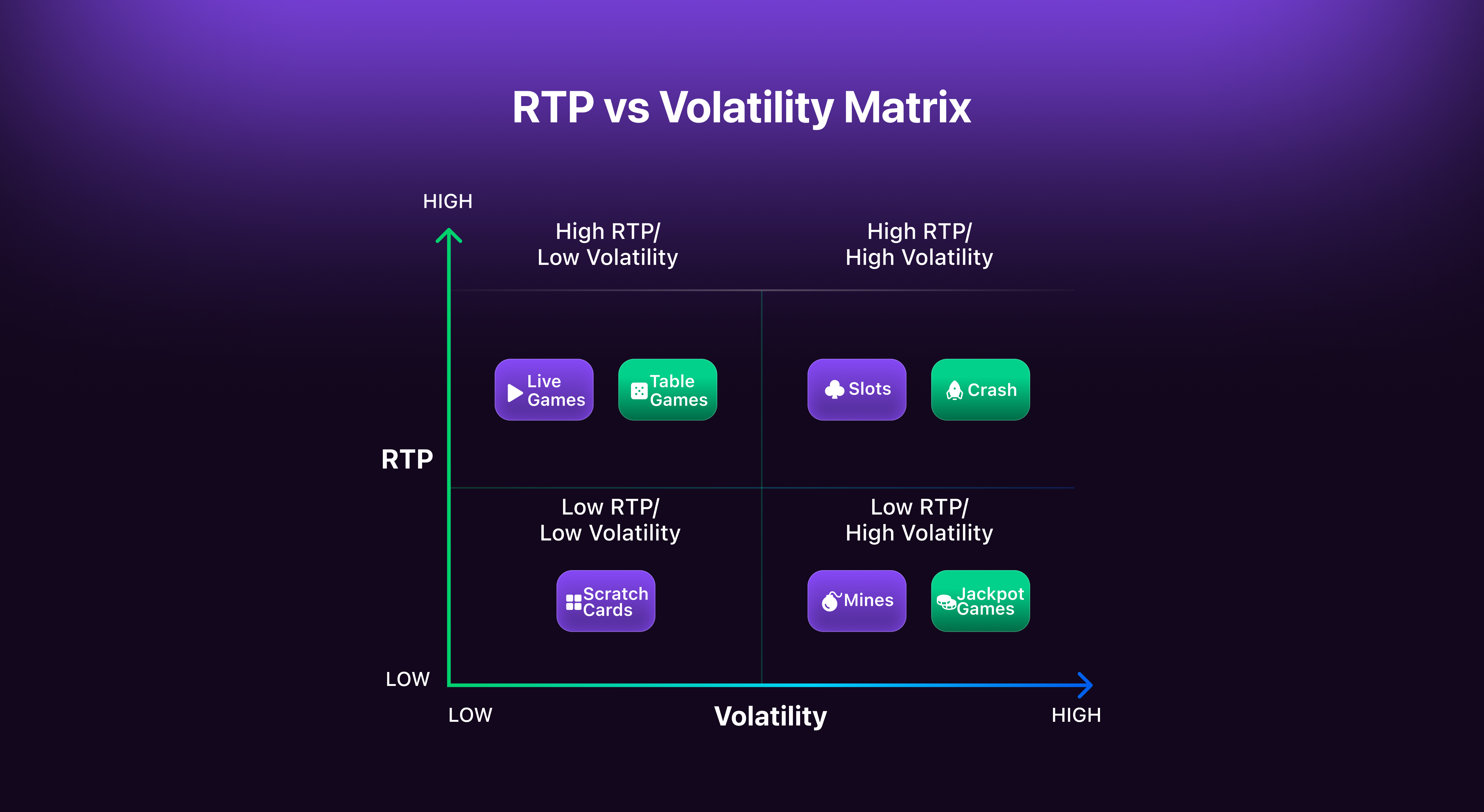 When RTP and volatility are viewed together, they form a matrix that highlights four distinct gameplay profiles. Each quadrant serves a different player mindset and use case.